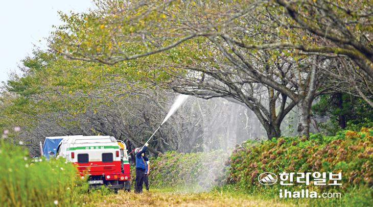 16일 서귀포시 표선면 가시리 녹산로 가로수인 왕벚나무가 해충과 세균 등으로 인한 피해가 잇따르자 관계당국이 방역작업을 하고 있다. 강희만기자