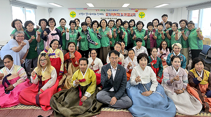 제주시새마을부녀회(회장 강길선)는 지난 16일 제주시새마을알뜰매장 교육실에서 전통문화학습센터(대표 김혜란)를 초대해 결혼이주여성 및 각 읍면동부녀회장 등 60명을 대상으로 전통예절교육 및 한가위 체험활동을 진행했다.
