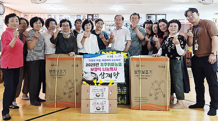 서귀포시 제주위미농협(조합장 현재근)은 지난 15일 위미2리 경로당을 방문해 어르신들을 위한 보양식 나눔 행사와 함께 고령 농업인을 위한 보행기를 전달했다.