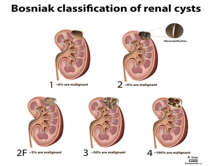 단순 신낭종은 낭종 벽이 매끈하고 얇으며 낭종 내부에 내부음영이 없이 완전히 검게 보이는 반면, 낭종벽이 두껍거나 불규칙하며 낭종 안에 두껍거나 불규칙한 중격이 보이고 독립적인 고음영 병변이 발견되면 낭종성 신장암으로 분류한다.