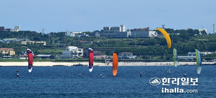 [한라일보] 18일 제주시 구좌읍 종달리 앞바다를 찾은 수상레저객들이 우도를 배경으로 카이트서핑을 즐기고 있다. 카이트서핑은 바람을 이용해 보드를 타고 물 위를 이동하는 익스트림 스포츠로, 서핑과 윈드서핑의 요소를 결합한 레저스포츠다. 강희만기자