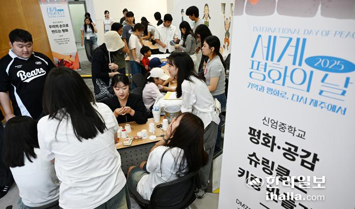 [한라일보] 21일 제주시 제주4·3평화공원에서 열린 제1회 '2025 세계 평화의 날 기념행사'에 참가한 학생들이 체험활동을 하고 있다. 강희만기자