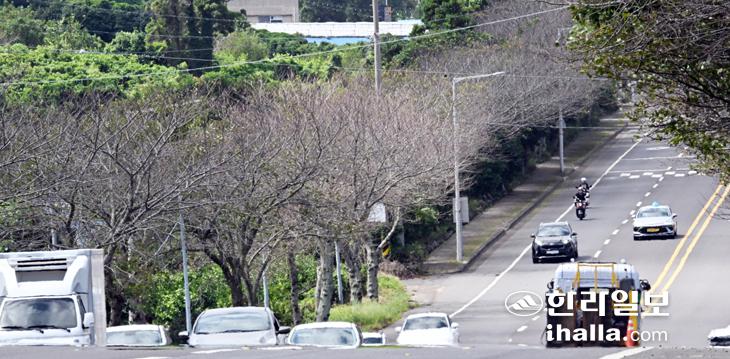 [한라일보] 22일 서귀포시 성산읍 금백조로 도로변에 심어진 왕벚나무의 잎이 해충 피해로 가지만 앙상한 모습을 하고 있다. 강희만기자