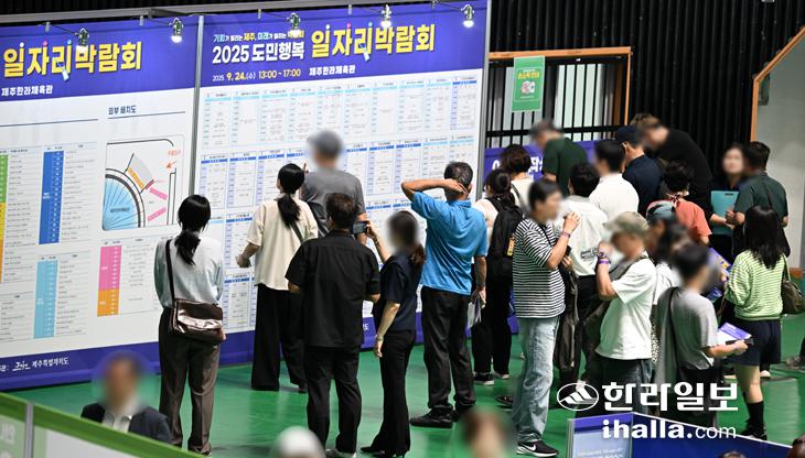 [한라일보] 24일 제주시 한라체육관에서 '2025 도민행복 일자리 박람회'가 열린 가운데 이 곳을 찾은 많은 구직자들이 다양한 취업지원 서비스와 기업 부스를 둘러보고 있다. 강희만기자