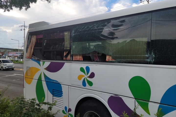25일 오전 제주시 화북공업단지 인근 도로에서 통학버스와 5t 화물트럭이 부딪히는 사고가 발생했다. 제주소방안전본부 제공