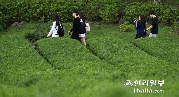 [한라일보] 25일 서귀포시 안덕면 서광리 오설록을 찾은 관광객들이 녹차밭을 거닐고 있다. 강희만기자