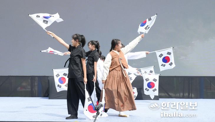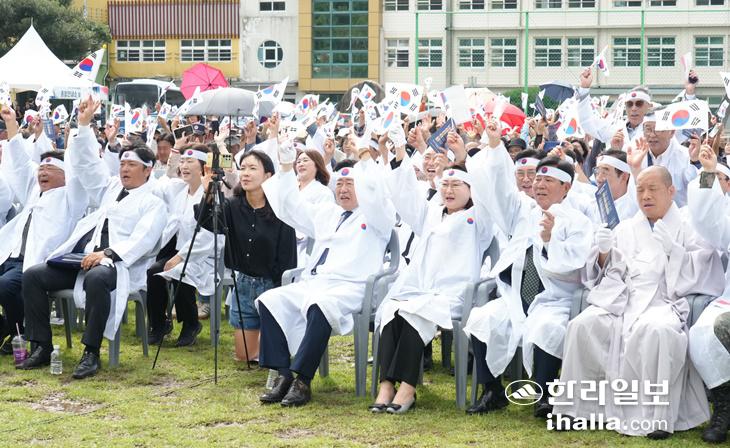 28일 서귀포시 중문중학교 운동장에서 열린 제107주기 무오법정사 항일항쟁 기념식에서 참석자들이 마지막 순서로 마련된 창작 뮤지컬 공연과 연계해 태극기를 들며 만세삼창을 하고 있다. 제주도 제공