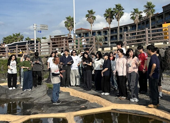 구엄리 돌염전을 둘러보는 제주대 관광경영학과 학생들.