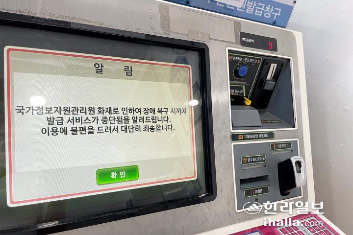 29일 오전 제주시 노형동주민센터의 무인민원발급기에는 “국가정보자원관리원 화재로 인하여 장애 복구 시까지 발급 서비스가 중단됨을 알려드립니다”라고 적힌 안내 화면이 나왔다.