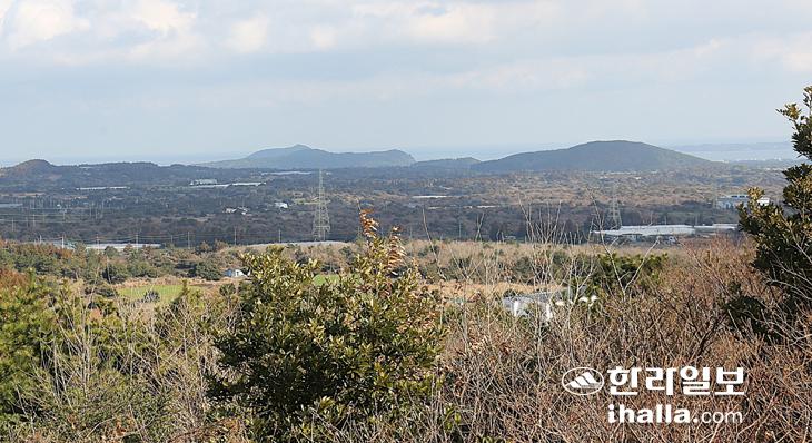 물미, 정면 오른쪽, 그 뒤로 대왕산, 두산봉(말미오름), 지미봉이 보인다. 낭끼오름에서 촬영. 김찬수