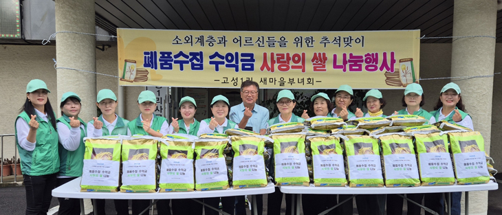 제주시 애월읍 고성1리새마을부녀회(회장 김영이)는 지난달 28일 폐품수거 수익금으로 지역 내 소외계층과 70세 이상 마을 어르신들 가정에 직접 방문해 사랑의 쌀(10kg 83포)을 전달했다.