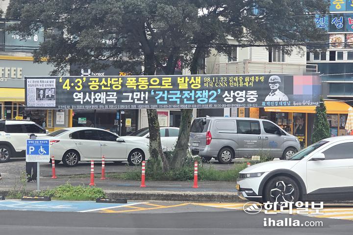 지난달 30일 제주대학교 정문 앞에 내걸린 ‘4.3 왜곡 현수막'. 독자 제공