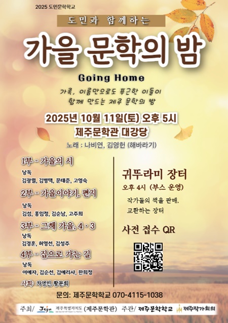 제주문학학교와 제주작가회의는 오는 10월 11일 오후 5시 제주문학관 대강당에서 '도민과 함께 하는 가을 문학의 밤'을 연다.