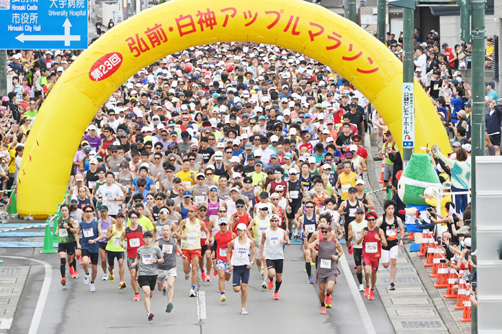 오전 9시부터 풀코스 참가자들은 아오모리현 히로사키시 니시메야무라(마을) 일대를 달리기 시작했다. 이후 15분 간격으로 구간별 출발이 이뤄졌다. 만화 강국답게 코스프레를 한 참가자들이 사람들의 흥을 돋우기도 했다. 특히 아오모리는 내년, 우리나라의 전국체전과 비슷한 ‘국민스포츠대회’을 앞두고 해당 대회의 마스코트를 출발선에 내세웠다.