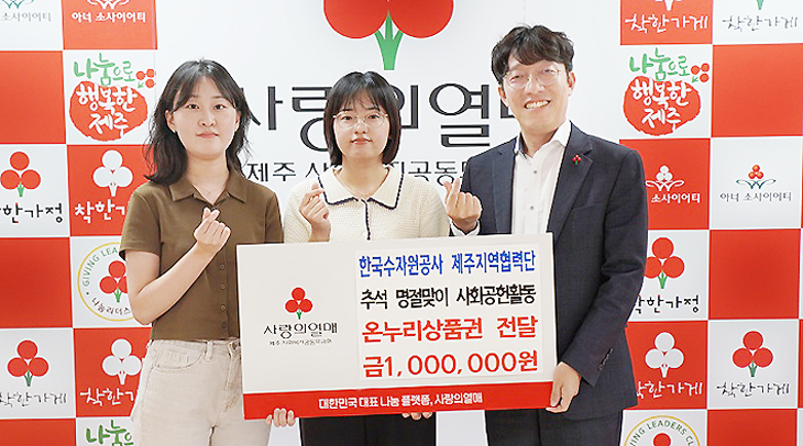K-water 한국수자원공사 제주지역협력단(단장 심과학)은 지난 1일 제주사회복지공동모금회 나눔실에서 온누리상품권 100만원을 제주사회복지공동모금회(회장 강지언)에 기탁했다.