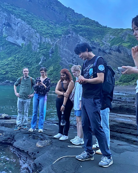 성산일출봉에서 외국인을 대상으로 제주의 자연과 문화를 해설하는 예혁씨.