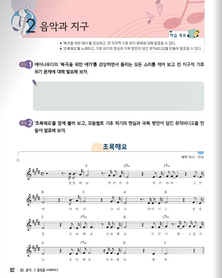 고등학교 음악교과서(박영사)에 실린 예혁의 노래 '초록해요'