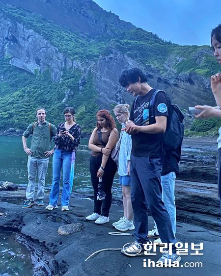성산일출봉에서 외국인을 대상으로 제주의 자연과 문화를 해설하는 예혁씨.