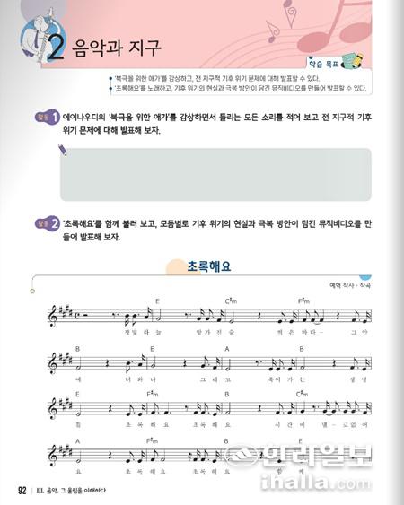 고등학교 음악교과서(박영사)에 실린 예혁의 노래 '초록해요'