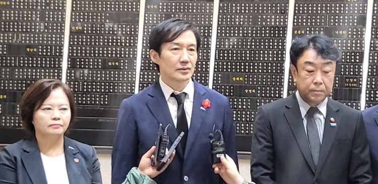 조국 조국혁신당 비상대책위원장이 18일 오전 제주시 봉개동 제주4·3평화공원에서 참배 후 취재진의 질문에 답변하고 있다. 오소범 기자