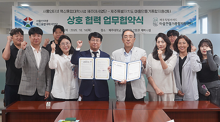 제주도 마을만들기종합지원센터(센터장 문만석)는 지난 16일 제주대학교 사물인터넷 혁신융합대학사업 제주대사업단(단장 김도현)과 '주민주도형 스마트마을 구축 및 디지털 역량 강화'를 위한 업무협약을 체결했다.