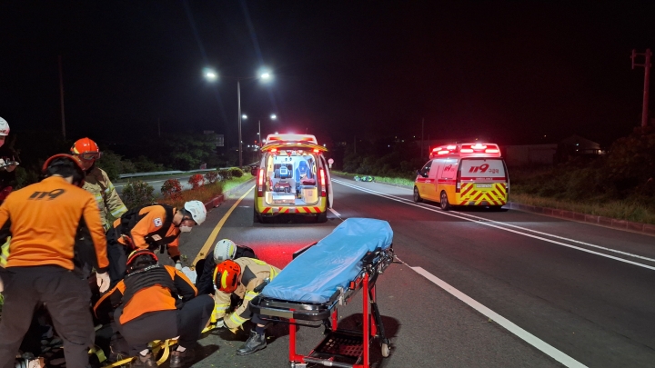 22일 새벽 제주시 애월읍의 한 도로에서 오토바이를 몰던 20대 남성이 숨지는 사고가 발생했다. 제주소방안전본부 제공