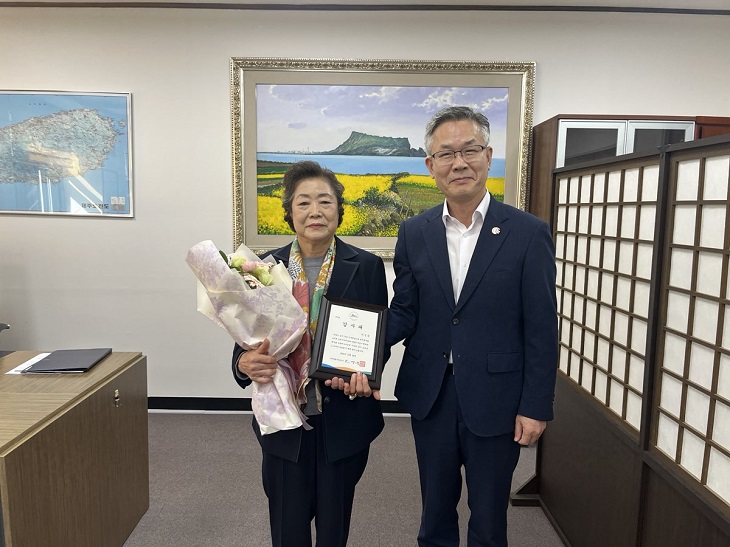 제주특별자치도는 24일 행정부지사실에서 곶자왈 토지를 기부한 이신숙 씨에게 감사패를 전달했다. <사진>