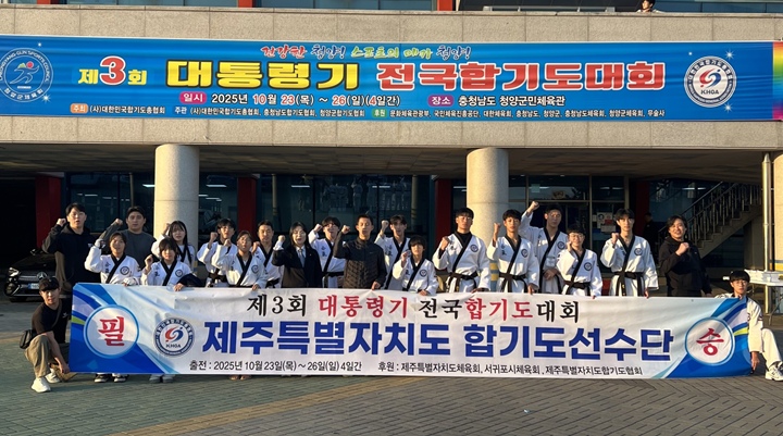 제3회 대통령기 전국합기도 대회에서 금메달 2개 등 5개 메달을 획득한 제주선수단이 기념 촬영하고 있다.