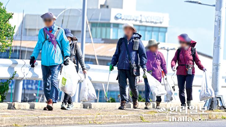 [한라일보] 27일 서귀포시 성산읍 성산항 인근에서 올레꾼들이 플로깅을 하며 걸어가고 있다. 플로깅(plogging)은 달리기를 하면서 쓰레기를 줍는 운동으로, 이삭 등을 줍는다는 뜻의 스웨덴어 'plocka upp'과 영어의 달리기를 뜻하는 'jogging'의 합성어이다. 강희만기자
