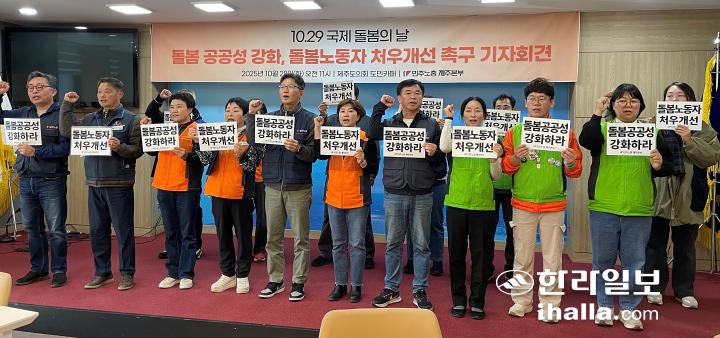 민주노총 제주본부는 28일 오전 제주도의회 도민카페에서 '돌봄 공공성 강화, 돌봄노동자 처우개선 촉구' 기자회견을 열었다.