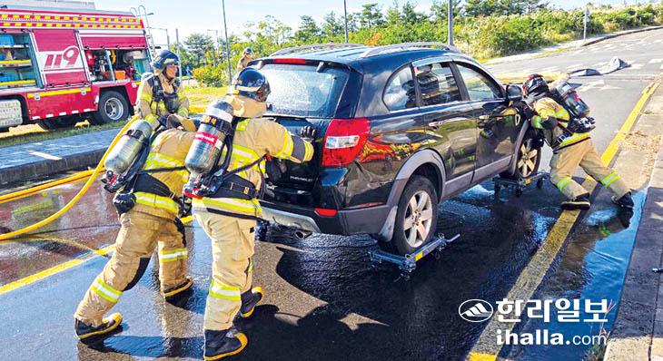 서귀포소방서(서장 고정배)는 28일 서귀포시 토평동 헬스케어타운 일대에서 소방차 통행을 방해하는 차량에 대한 강제처분 훈련을 실시했다.