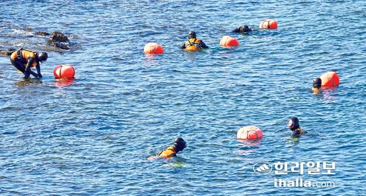[한라일보] 29일 제주시 한림읍 수원리 해안에서 해녀들이 물질을 하고 있다. 강희만기자