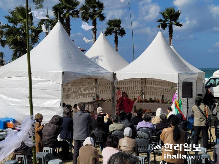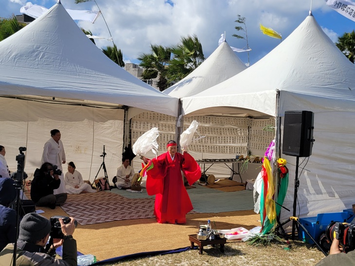 1일 오전 제주시 조천읍 함덕리 서우봉 입구에서 열린 찾아가는 4.3현장위령제 '함덕 서우봉 해원상생굿'에서 집전을 맡은 서순실 심방이 이끄는 제주큰굿보존회가 4·3영혼들이 좋은 곳으로 가도록 기원하는 위령굿 '시왕맞이'를 행하고 있다. 박소정기자