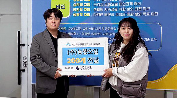 [한라일보] 월드프렌즈(대표 김성용)는 지난달 30일 제주특별자치도청소년자립지원관(이용형)(관장 김성훈)에 놋향오일 200개를 전달했다.