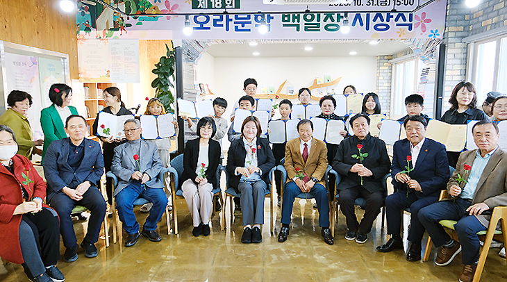 [한라일보] 제주시 오라동(동장 강리선) 책읽는주부들의모임 (회장 문명숙)은 지난달 31일 오라공설책마을에서 '제18회 오라문학백일장 시상식'을 개최했다.