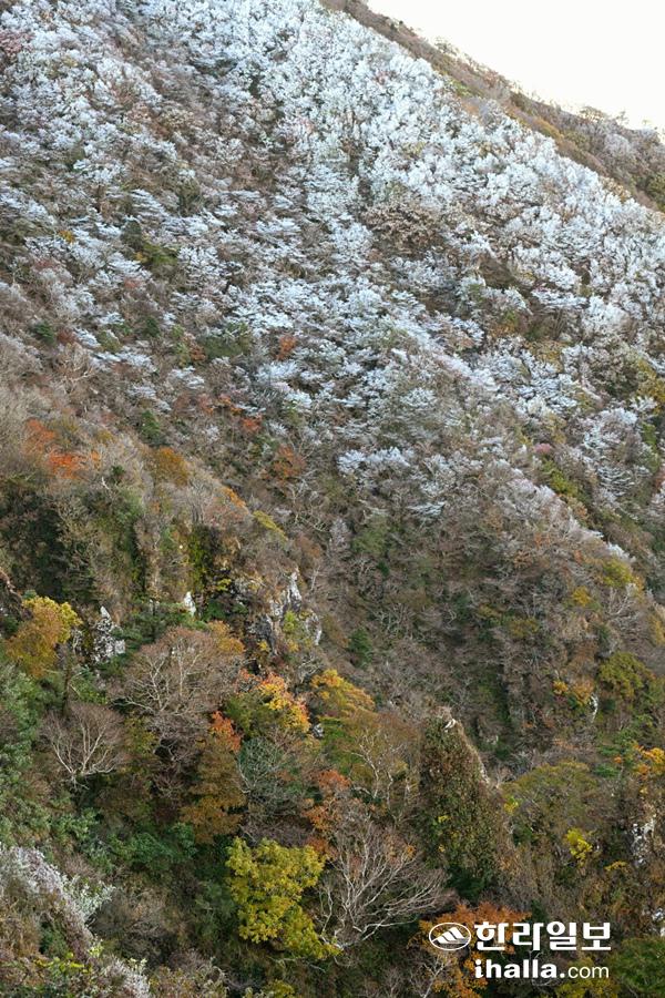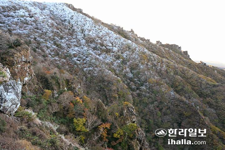 [한라일보] 찬 대륙고기압의 영향으로 단풍이 시작된 한라산 영실계곡에 상고대가 활짝 피었다. 지난달 31일 첫 관측된 한라산 단풍은 지난해보다 2일 늦었고 2주 후에 절정을 이룰 것으로 제주기상청은 내다봤다.