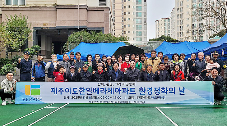 제주이도한일베라체아파트(입주자 대표회장 강석진) 는 지난 8일 입주민과 관리소직원 등 60여 명이 참석한 가운데 '환경정화활동 및 입주민 간담회'를 열었다.