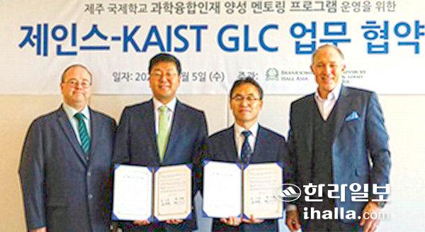 [한라일보] 제주 국제학교 법인 JEINS(대표 김기영)와 KAIST 글로벌리더십센터(센터장 장기태)는 지난 15일 제주 영어교육도시 내 세인트존스베리아카데미 제주(SJA Jeju)에서 국제학교 학생들의 이공계 과학기술 중요성과 역량 강화를 위한 멘토링 프로그램 업무협약(MOU)을 체결했다.