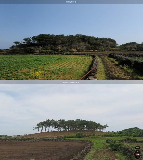 2020년 산림 훼손 전 모습(사진 위)과 2024년 산림 훼손 이후 모습. 제주자치경찰단 제공