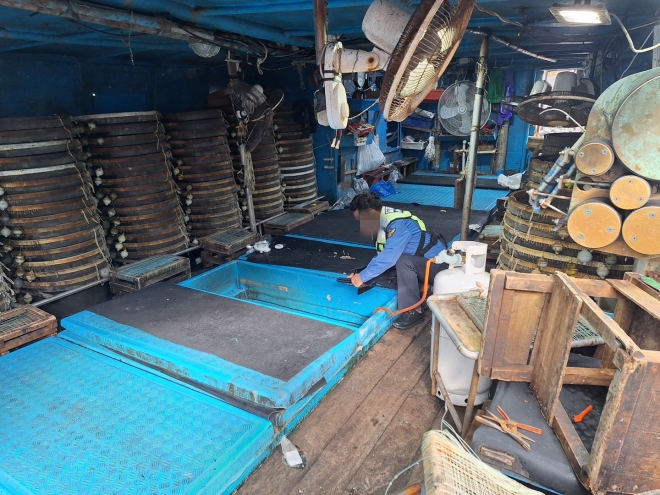 11일 오전 서귀포시 대정읍 하모리 모슬포수협 앞 바다에서 어선 화재가 발생했다. 제주소방안전본부 제공