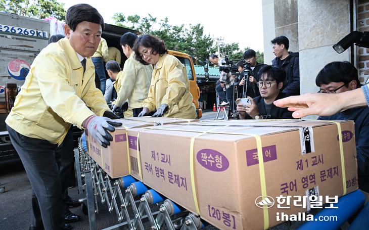 [한라일보] 11일 김광수 제주도교육감과 실·국장 등이 항공편으로 제주에 도착한 2026학년도 대학수학능력시험 문제지와 답안지를 교육청 내 보관 장소로 옮기고 있다. 강희만기자
