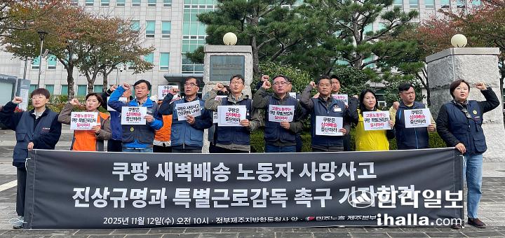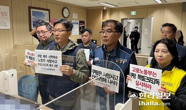12일 오전 민주노총 제주본부는 정부제주지방합동청사 앞에서 기자회견을 열고 30대 쿠팡 새벽배송 기사 사망사고에 대한 진상조사와 특별근로감독을 촉구했다.