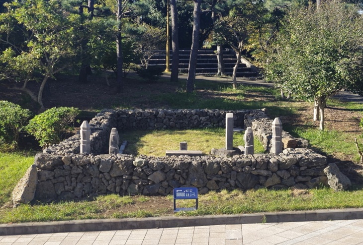 [한라일보] 이승을 떠나는 제주 사람들의 마지막 안식처가 돼 준 무덤 주위에 쌓은 돌담인 '산담'. 국립제주박물관이 이를 야외 전시장에 재현했다.