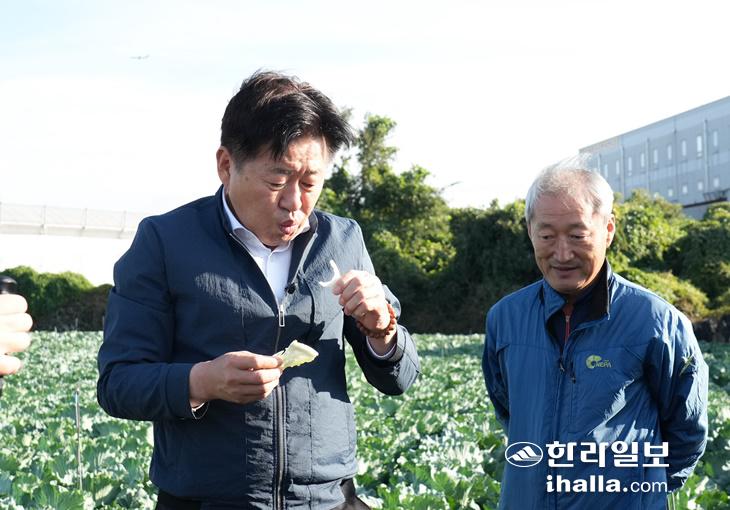 오영훈 지사가 지난 3일 제주시 애월읍 신엄리 양배추 농가를 찾았다.제주도 제공