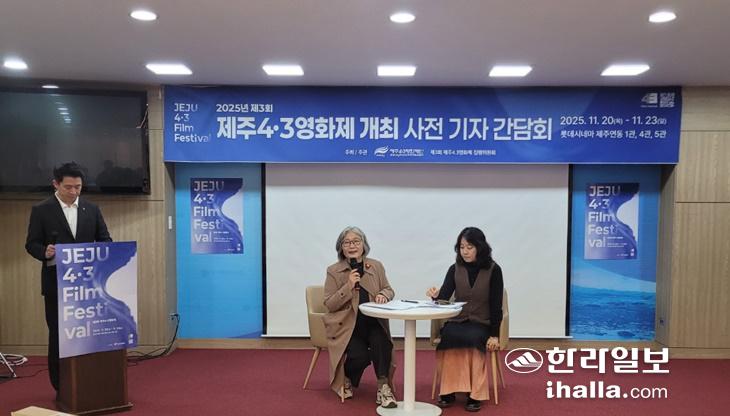 13일 오전 제주도의회 도민카페에서 열린 2025 제3회 제주4·3영화제 기자간담회에서 강은미 영화제 집행위원장이 영화제에 대해 설명하고 있다. 박소정기자