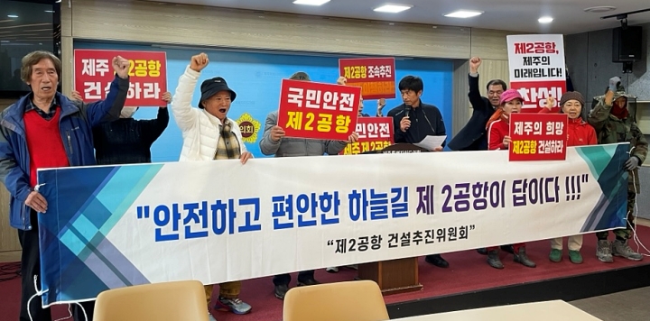 제주제2공항 찬성단체가 13일 오전 제주도의회 도민카페에서 기자회견을 열었다.