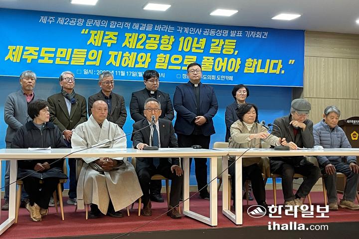 17일 문창우 천주교 제주교구장 등 186명이 이름을 올린 ‘제2공항 문제의 합리적 해결을 바라는 각계 인사 공동성명’ 참여자들은 제주도의회 도민카페에서 기자회견을 열고 “제2공항 10년 갈등, 제주도민 스스로의 결정으로 해결해야 한다”고 주장했다.