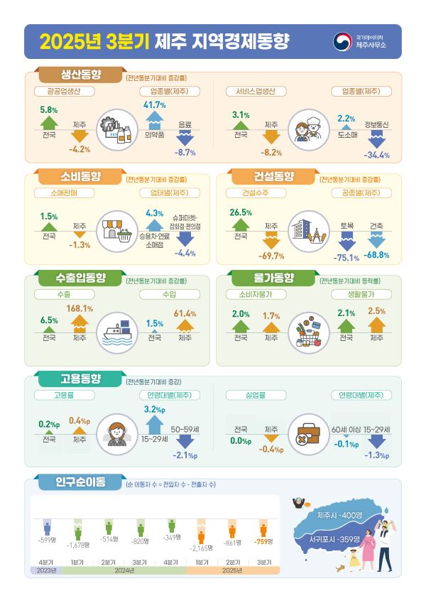 [한라일보] 올해 3분기 제주지역 경제는 생산·소비 부진과 건설경기 급락 속 전반적인 둔화 흐름을 이어갔다. 젊은층을 중심으로 한 인구 순유출도 지속된 가운데 수출은 증가했고 고용지표는 개선 흐름을 보였다.