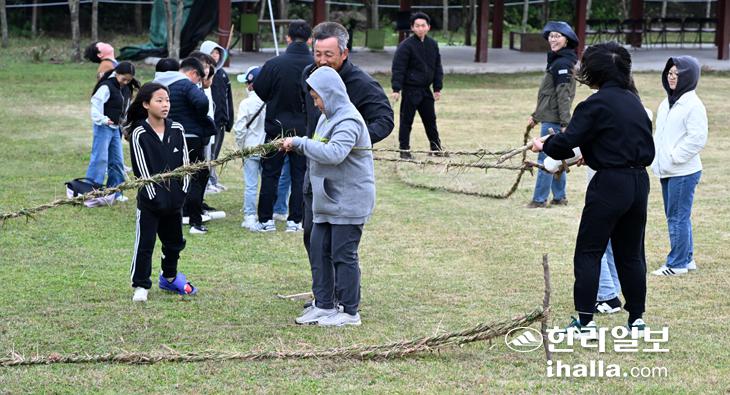 [한라일보] 17일 서귀포시 성산읍 수산리 제주자연생태공원을 찾은 한마음초등학교 어린이들이 집줄놓기 체험을 하고 있다. 강희만기자