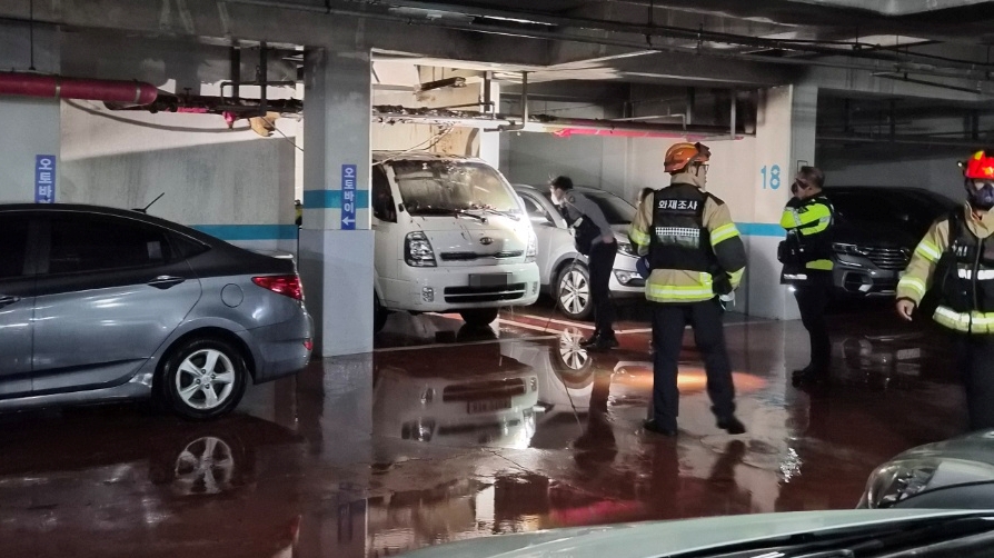 지난 18일 밤 제주시 화북1동의 한 아파트 지하주차장에 있던 1t 트럭 적재함에서 화재가 발생했다. 독자 제공